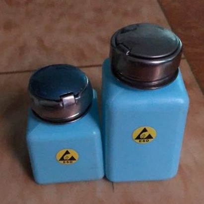 Antistatická alkoholová fľaša, známa tiež ako ESD fľaša na alkohol, je ideálnym zariadením na absorpciu alkoholu, acetónu, metanolu, riedidla a ďalších činidiel s bavlnenými tampónmi, handrami a bavlnenými guličkami. Existujú dva hlavné materiály: plast a sklo, so závesmi. Kryt zaisťuje, že činidlo nebude kontaminované, keď sa nepoužíva. Konštrukcia hlavy z nehrdzavejúcej ocele zabezpečuje použitie silných reagencií. Presne spracovaný ventil môže zabrániť odparovaniu a vytekaniu rozpúšťadla. Časť viažuca tekutinu je utesnená viskóznou vložkou, aby bola zaistená čistota činidla.